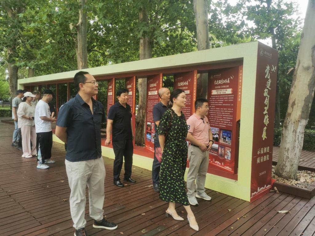 为贯彻落实党员大轮训要求,7月4日上午,总务公共事务服务中心组织党员在主校区图书馆对面的木栈道观看学校党建会议暨“七一”表彰大会配套的全校“党建双创工作展”。中心全体在职党员共计20人参加。
