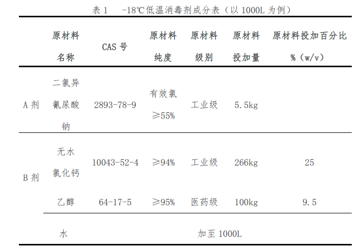 (一)低温消毒剂(-18℃)。包括二氯异氰尿酸钠、氯化钙和乙醇。现场使用时,-18℃低温消毒剂中有效氯浓度为0.3%(3000mg/L),无水氯化钙的含量为25%,乙醇的含量为9.5%。详见表1。
